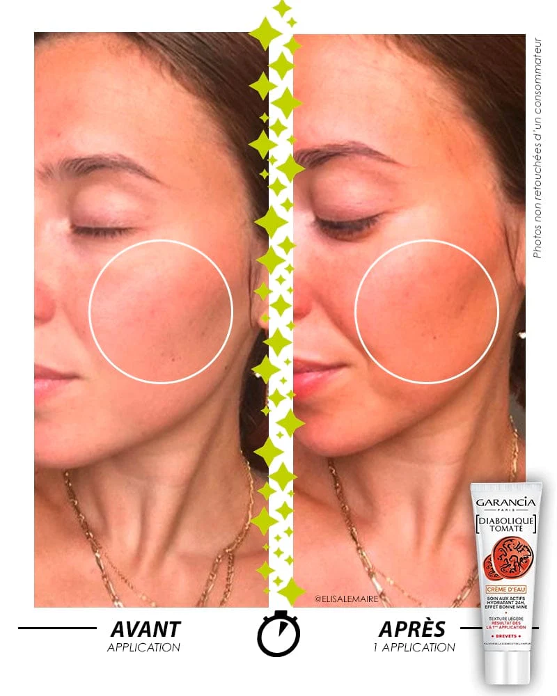 La [ DIABOLIQUE TOMATE ] Crème d’Eau est un véritable soin de beauté 3 en 1 gorgé d’actifs ultra hydratants 24h, repulpant et bonne mine immédiate. Elle relance l’hydratation naturelle de la peau(4) et l’aide à réapprendre à synthétiser ses propres lipides(5) (dont les céramides).